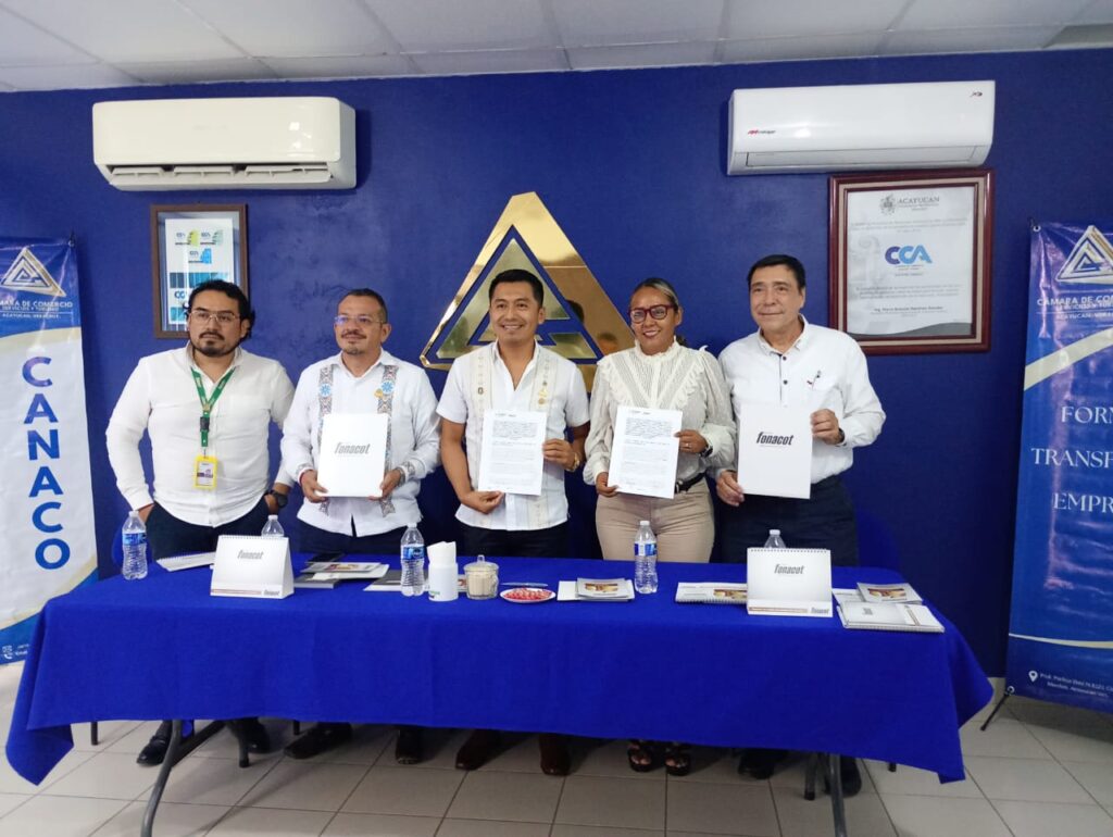 #ELEspacioDeAtenea.- A nombre de la Cámara Nacional de Comercio, Servicios y Turismo de Acayucan (Canaco -Servytur), su presidente, Filiberto Cuastle San Miguel, firmó un convenio de colaboración con el Instituto del Fondo Nacional para el Consumo de los Trabajadores ( Infonacot) a través de su directora estatal en Veracruz y Villahermosa, Brenda Cabrera Jiménez, con la presencia del licenciado Alfredo Fernández Peri, Director Comercial Regional para los estados de Puebla, Veracruz y Tabasco; Néstor Robles Gutiérrez, coordinador de Infonacot en la zona de Coatzacoalcos.