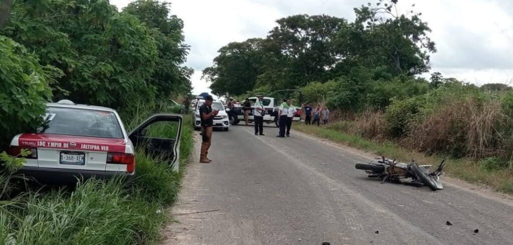 JÁLTIPAN, VER. – La tarde de este lunes, un accidente vial dejó gravemente herido al elemento de la Policía Municipal, Brian Ulises Mar Flores, luego de ser impactado por un taxi local mientras realizaba un recorrido en moto patrulla.